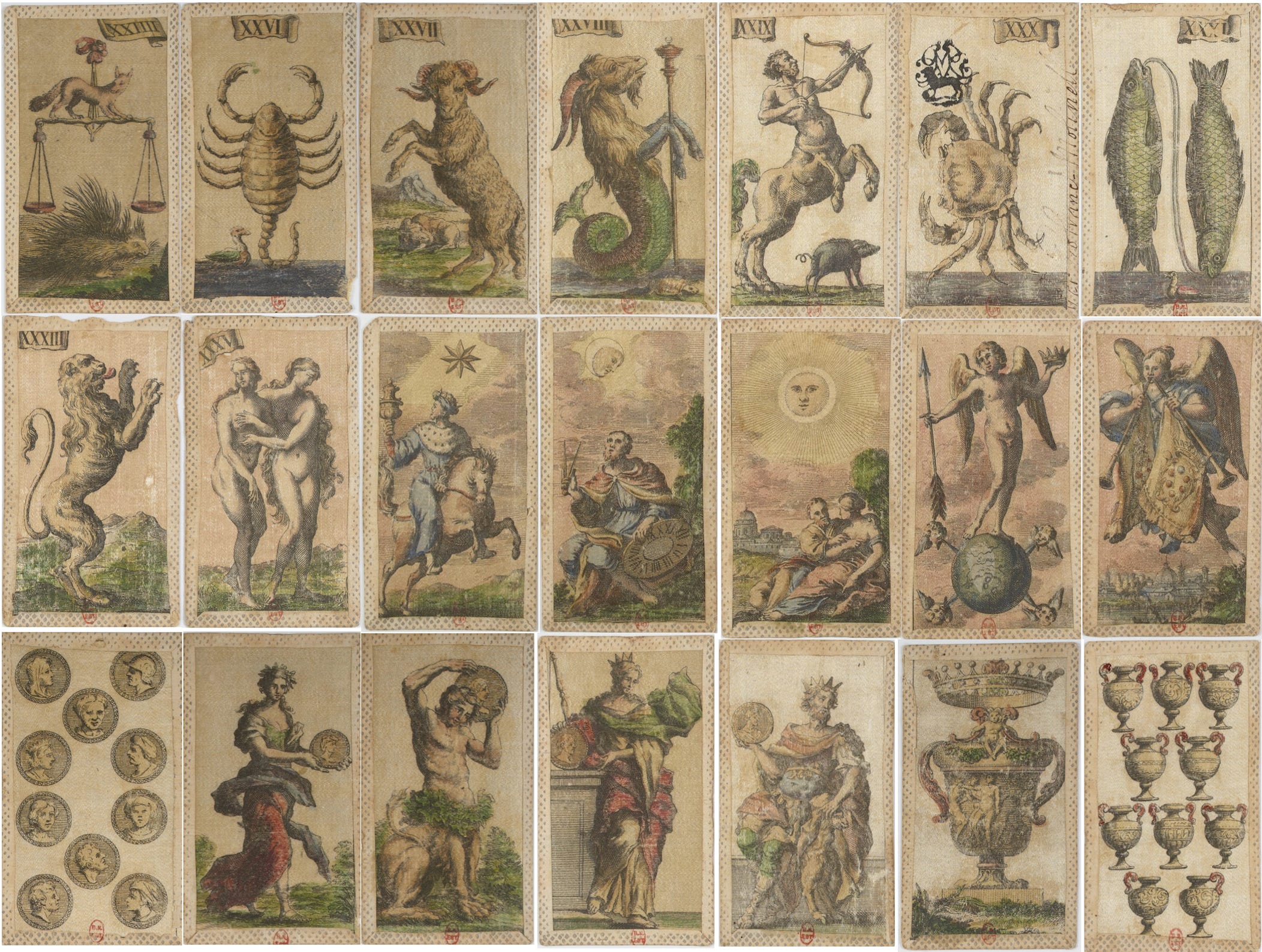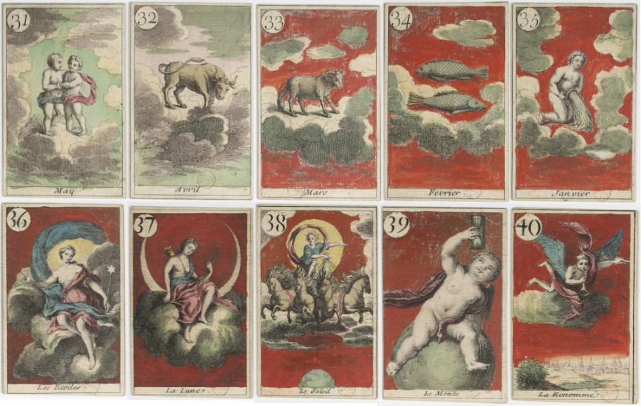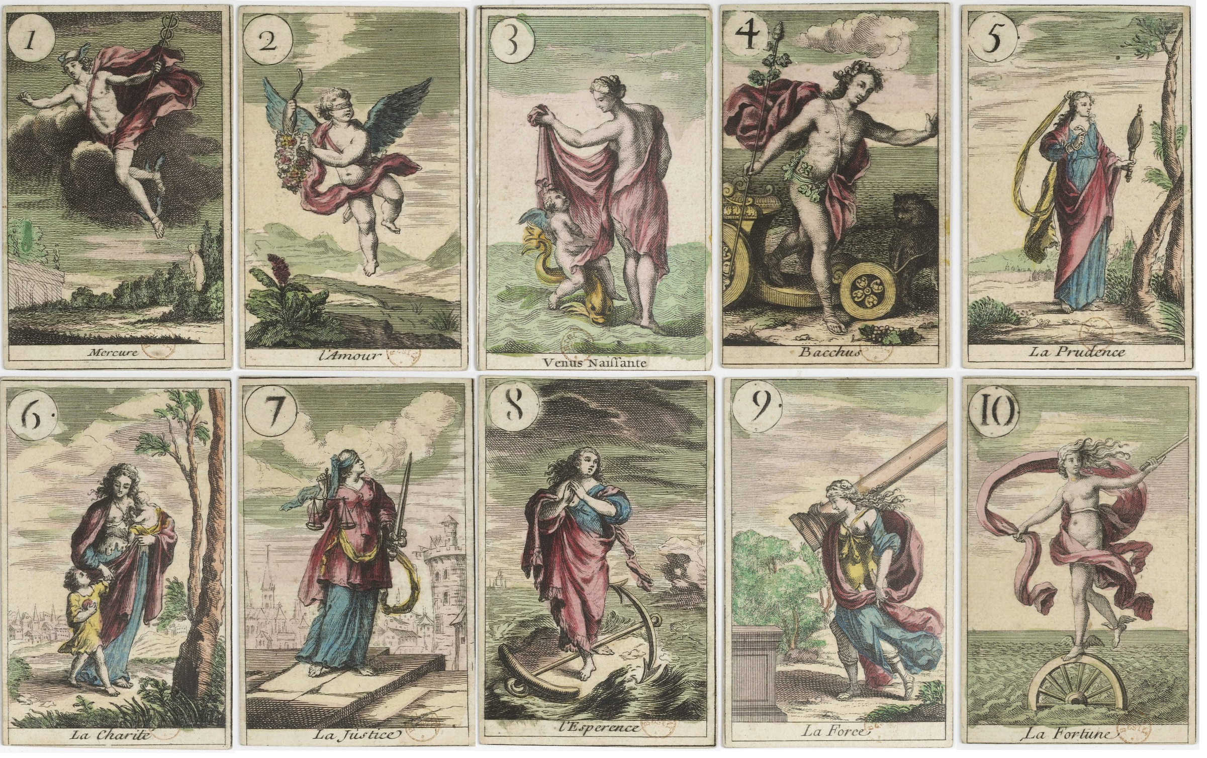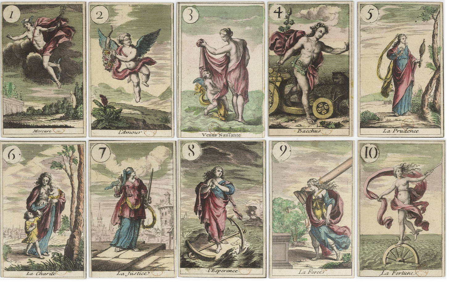 The French Engraver François de Poilly produced a unique French suited Minchiate deck after a trip to Italy in the 1650’s. His deck replaced many of the typical tarot figures with mythological figures, the stages of life and the 5 senses - the only thing left in intact were the virtues, the elements, the zodiac and of course the arie. The top 8 cards have red backgrounds like their Italian counterparts. The suit signs are each dedicated to a different continent: Hearts for Europe, Diamonds for Asia, Spades for Africa and Clubs for America. De Poilly’s Minchiate is the oldest known French suited tarot deck.