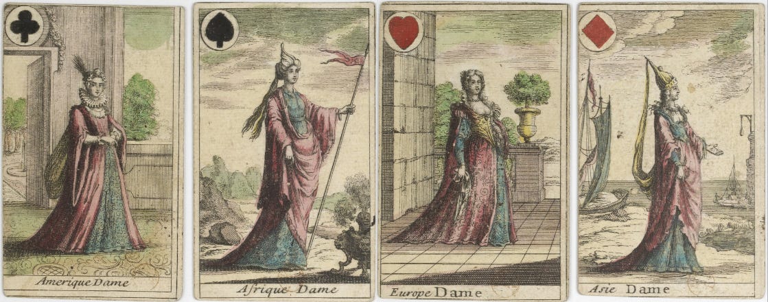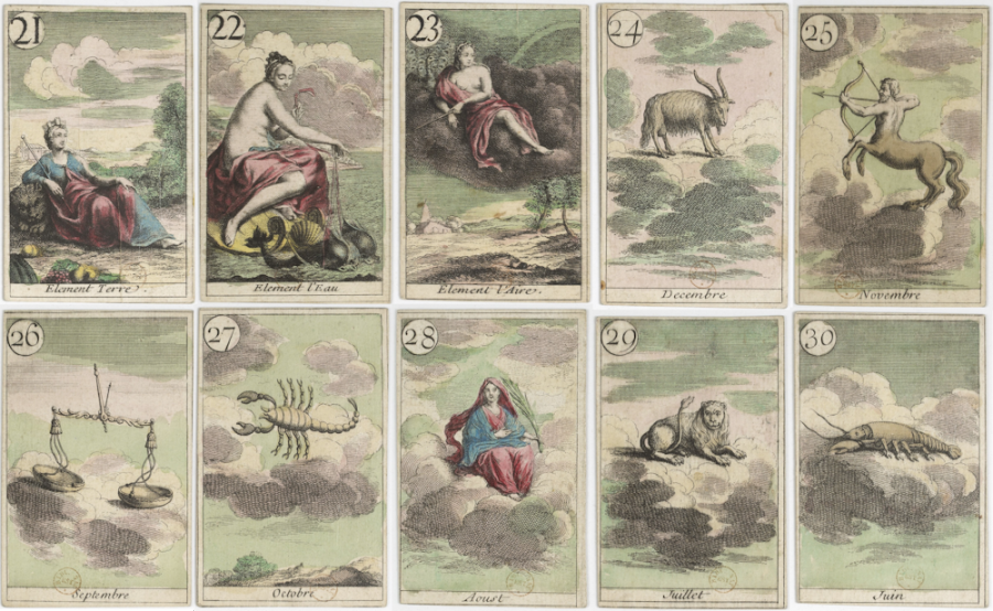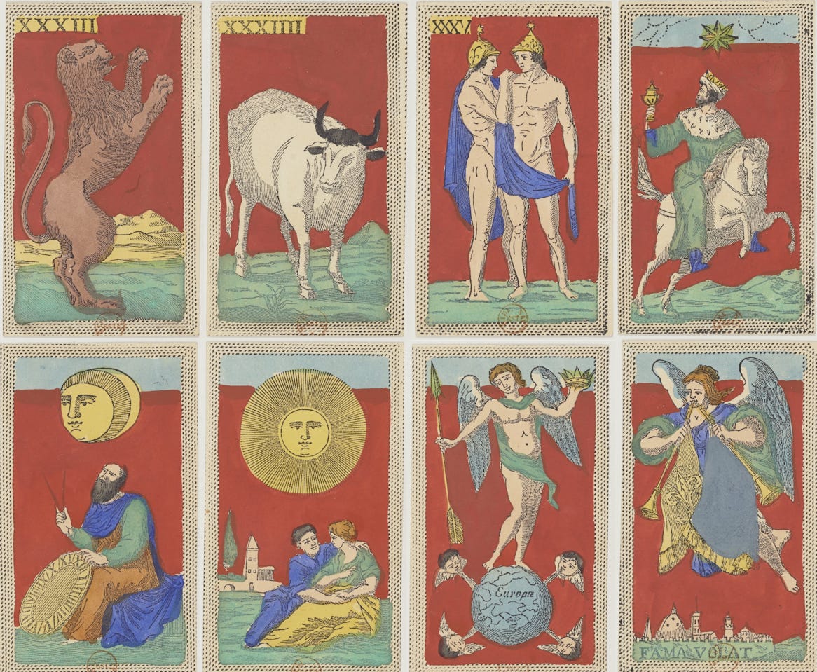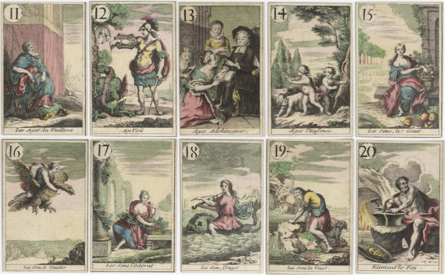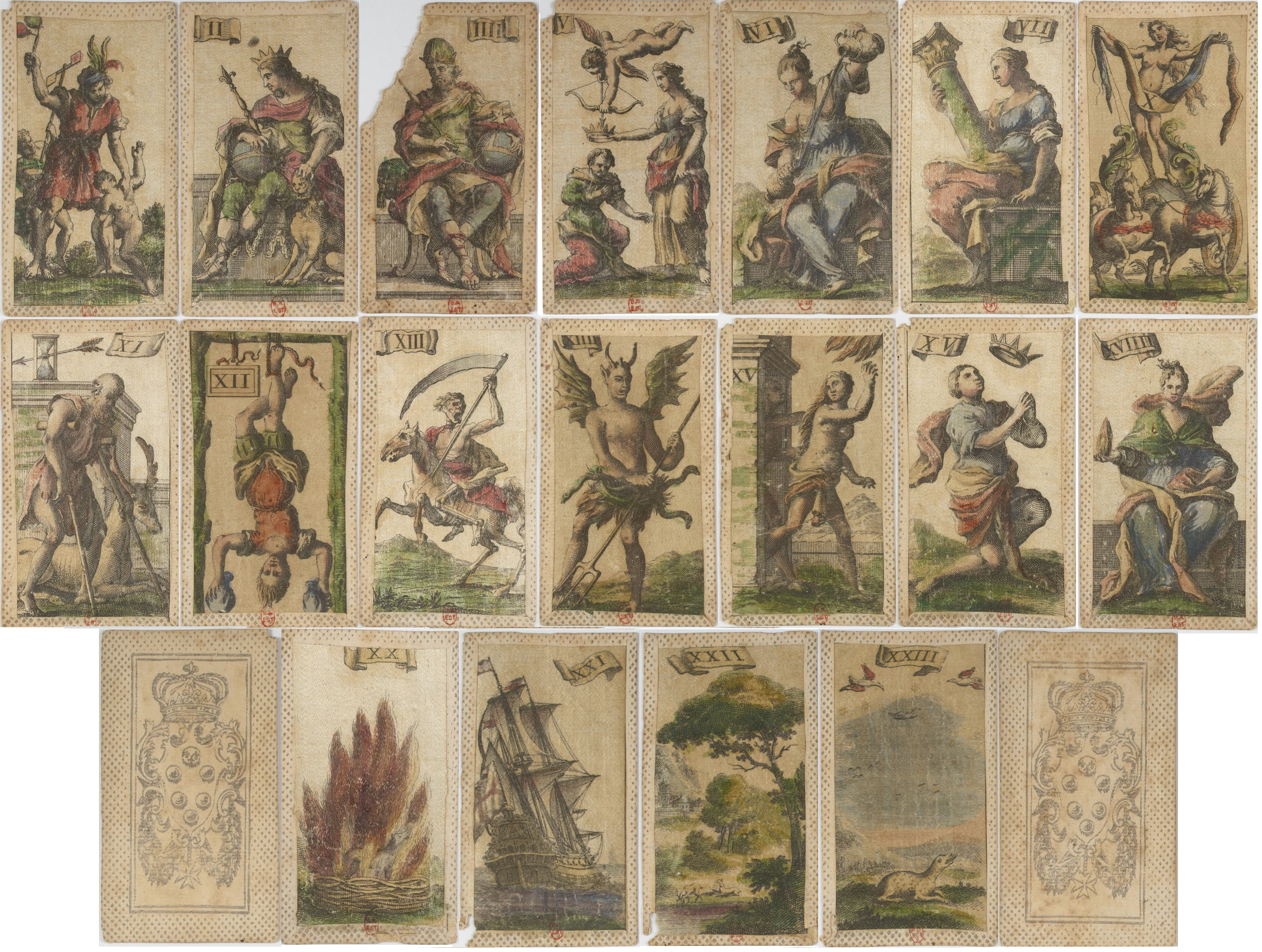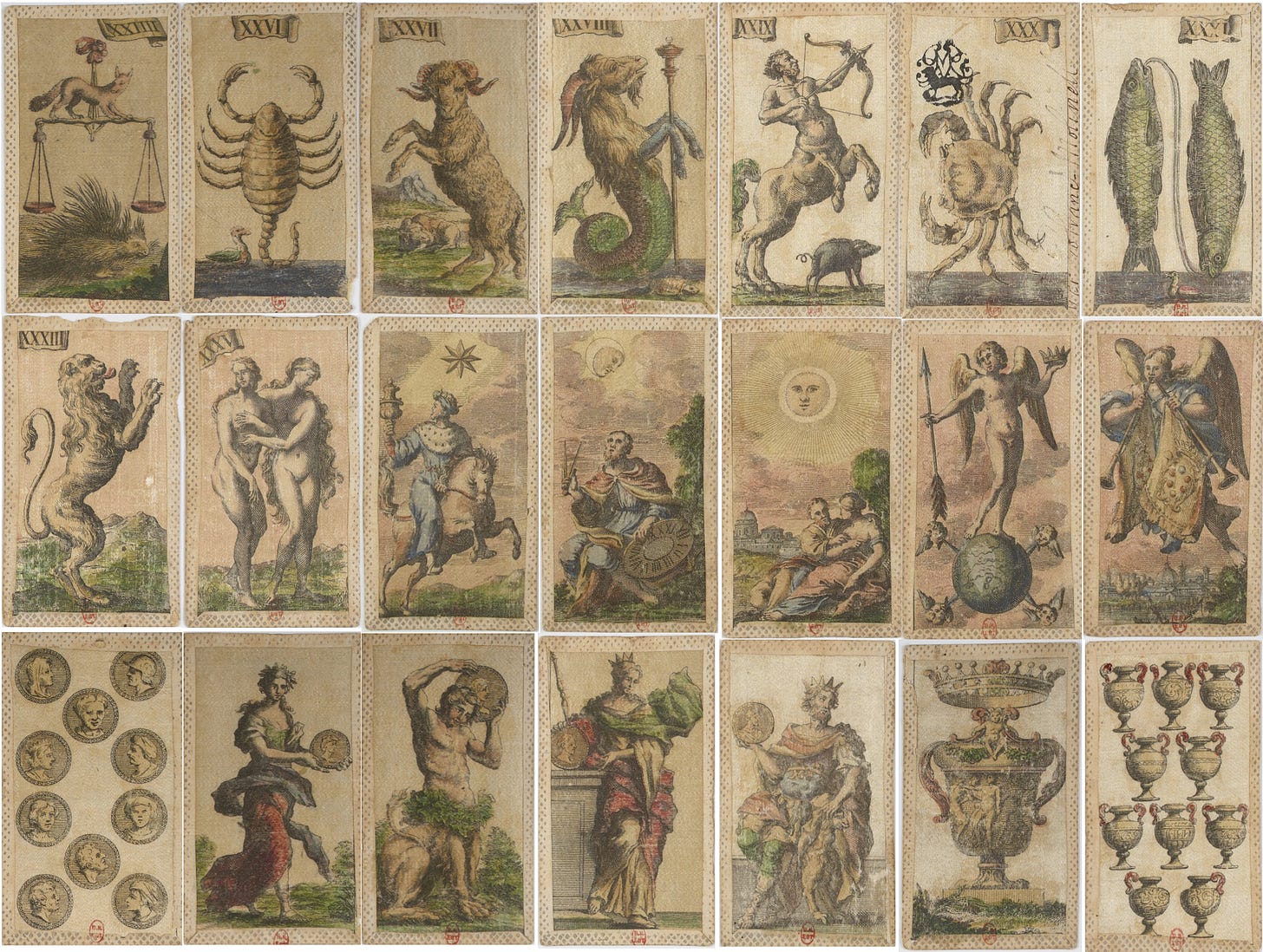 The French Engraver François de Poilly produced a unique French suited Minchiate deck after a trip to Italy in the 1650’s. His deck replaced many of the typical tarot figures with mythological figures, the stages of life and the 5 senses - the only thing left in intact were the virtues, the elements, the zodiac and of course the arie. The top 8 cards have red backgrounds like their Italian counterparts. The suit signs are each dedicated to a different continent: Hearts for Europe, Diamonds for Asia, Spades for Africa and Clubs for America. De Poilly’s Minchiate is the oldest known French suited tarot deck.